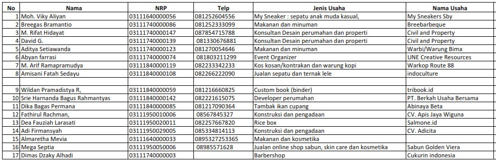 Program kreativitas mahasiswa yang dilakukan meliputi beberapa bidang usaha. Berikut adalah daftar mahasiswa Departemen Teknik Sipil ITS yang terlibat dalam beberapa jenis usaha.
