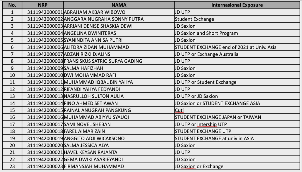 Daftar mahasiswa IUP Departemen Teknik Sipil ITS yang akan mengikuti program International Exposure: