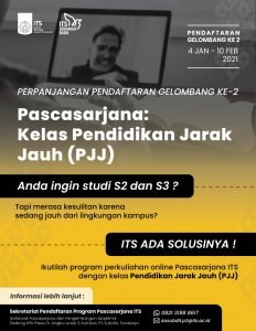 Masih dibuka Pendaftaran Gelombang 2 Pascasarjana Kelas Pendidikan Jarak Jauh (PJJ) Perkuliahan Online Pascasarjana ITS ini masih membuka pendaftaran hingga 10 Februari 2021. Info lebih lanjut bisa cek di poster berikut: