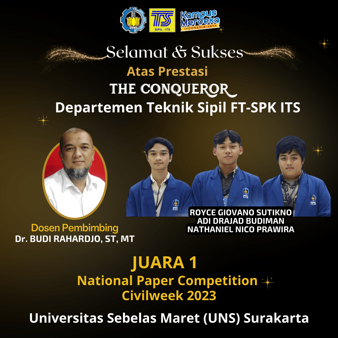 Selamat dan Sukses, atas Prestasi The Conqueror DTS-ITS yang beranggotakan: Royce Giovano Sutikno; Adi Drajad Budiman; dan Nathaniel Nico Prawira dengan Pembimbing Dr. Budi Rahadjo Meraih Gelar Juara 1 pada lomba National Paper Competition Civilweek 2023 di UNS.