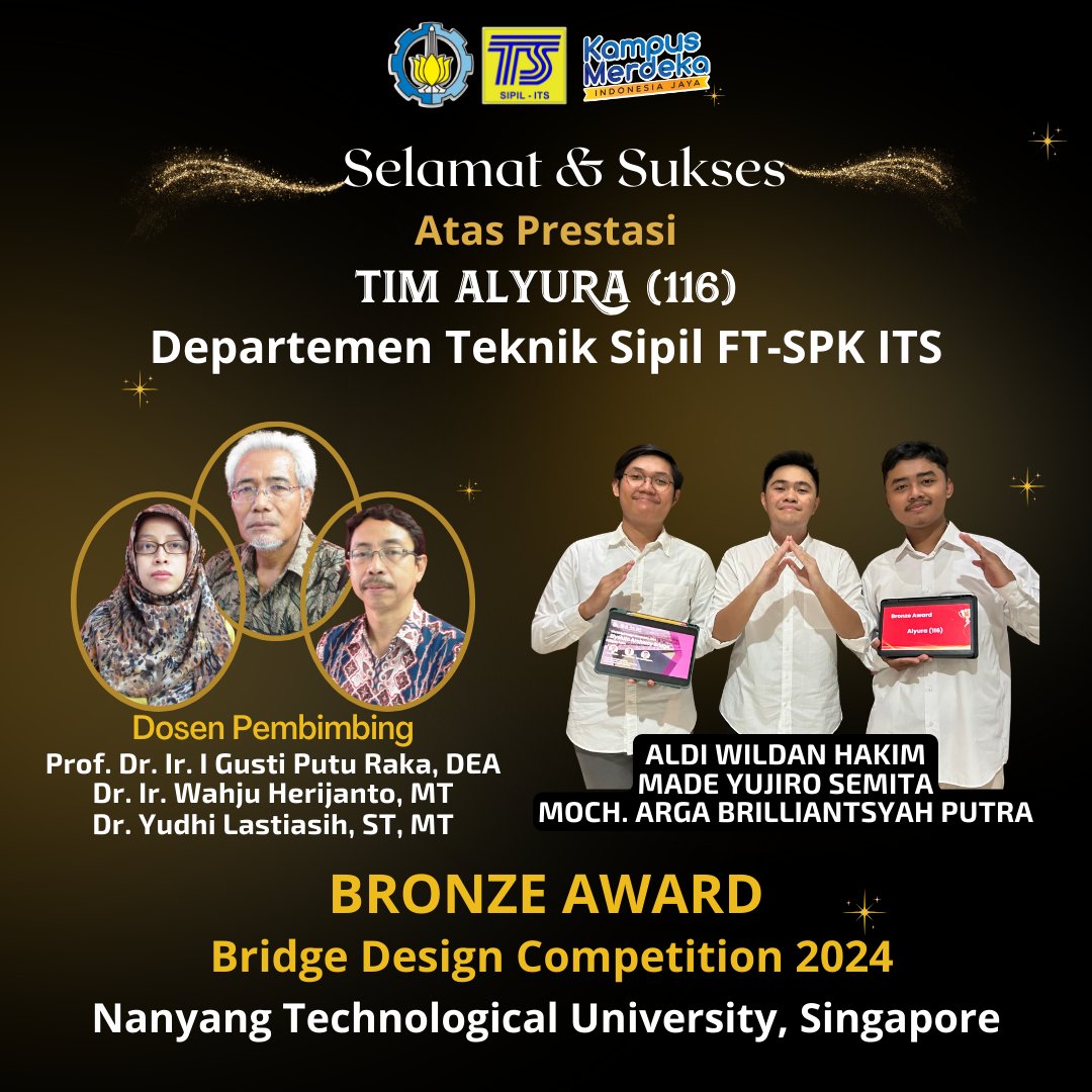 Selamat atas Prestasi meraih Juara 3 (Bronze Prize) pada lomba NTU Bridge Design Competition 2024. Tim Alyura (116) yang berkompetisi di Nanyang Technological University (NTU) Singapore merupakan bimbingan Prof. Dr. Ir. I Gusti Putu Raka, DEA; Dr. Ir. Wahju Herijanto, MT; dan Dr. Yudhi Lastiasih, ST, MT. #vivat #tradisijuara #itscampus
