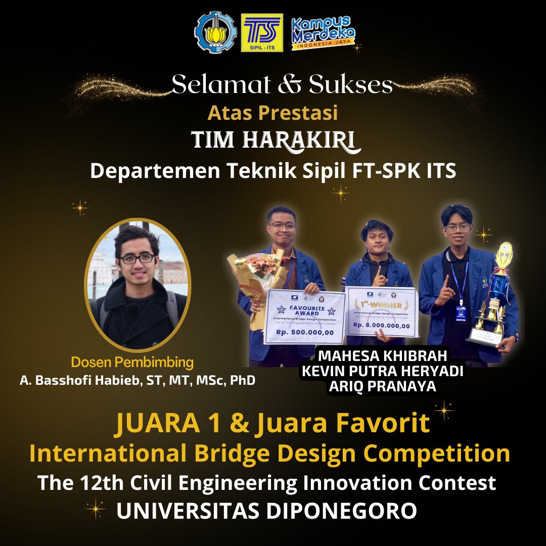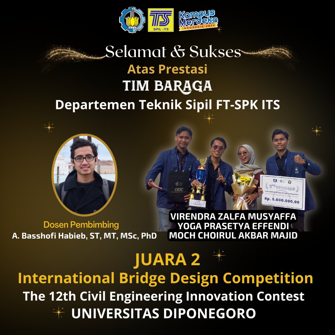 Berita Prestasi menggembirakan dari Tim Harakiri dan Tim Baraga Departemen Teknik Sipil FTSPK ITS yang berlaga pada kompetisi desain jembatan Internasional. Atas prestasinya memperoleh Juara 2 pada International Bridge Design Competition yg diselenggarakan oleh Civil Engineering Innovation Contest (CEIC) ke-12 Universitas Diponegoro. Tim Harakiri dan Tim Baraga merupakan bimbingan dari Dosen Departemen Teknik Sipil FT-SPK ITS yaitu Ahmad Basshofi Habieb, S.T., M.Sc., Ph.D. #vivat #tradisijuara #juara #prestasi #itscampus #sipilits