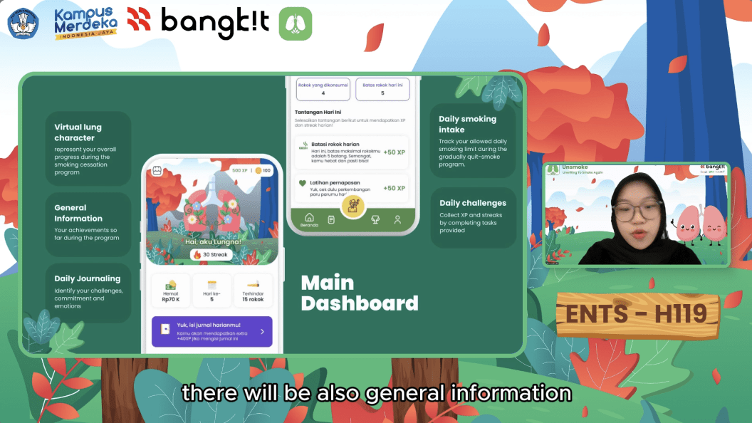 Unsmoke is Indonesia’s first companion app that leverages artificial intelligence (AI) and gamification to help users quit smoking, setting it apart through its unique approach. By utilizing data such as age, gender, smoking duration, and cigarette consumption, Unsmoke offers a tailored and guided quit-smoking program, providing a more flexible experience for users. This gradual approach is a key advantage, increasing the chances of quitting successfully compared to abrupt methods.