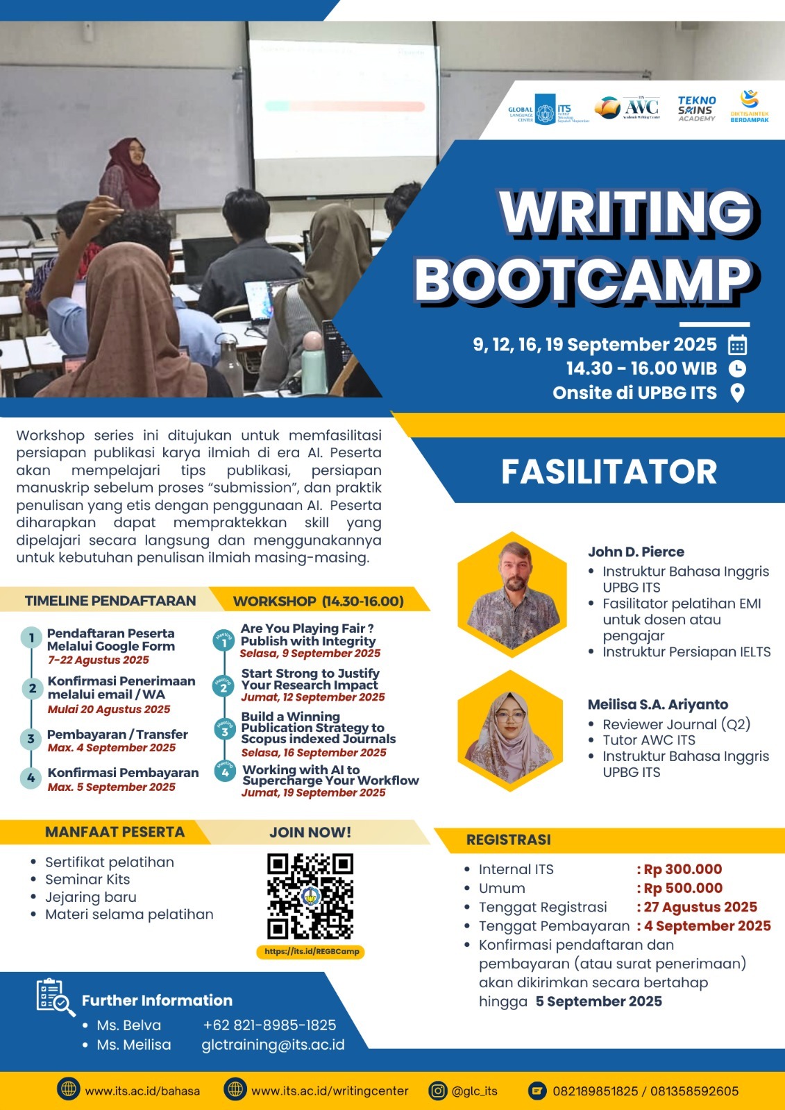 Academic Writing Center (AWC) ITS mempersembahkan Writing Bootcamp 2025, workshop intensif yang dirancang untuk memfasilitasi persiapan publikasi karya ilmiah di era AI. Peserta akan belajar tips publikasi, penyusunan manuskrip sebelum submission, hingga praktik penulisan yang etis dan efisien ketika menggunakan teknologi AI. Seluruh sesi akan dilaksanakan secara onsite dan interaktif! Kuota terbatas, yuk segera amankan tempatmu dan persiapkan publikasi ilmiahmu dengan lebih matang dan etis di era AI!