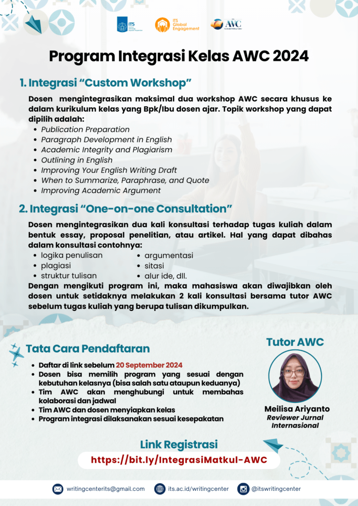 When the workshop is integrated into the course, the AWC facilitator and lecturer will create an assignment or quiz that students must complete and submit after the workshop concludes. AWC will provide materials, guidelines, and other supportive resources to ensure the smooth implementation of the workshop within the curriculum. Lecturers are encouraged to identify topics that align with the class’s needs and register at the link https://bit.ly/IntegrasiMatkul-AWC before March 5, 2024.